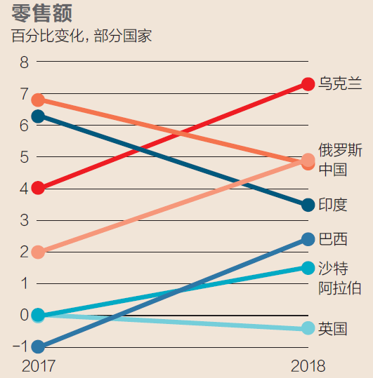 亚洲的零售销售额将占全球零售总额的五分之二以上,其中巴基斯坦的增长率最高(达到5.5%)。由于退出了与俄罗斯的全面战争,乌克兰的零售销售额将反弹7%。巴西经济低迷以及特朗普上台后墨西哥消费者信心指数下降等因素都将阻碍拉丁美洲的零售增长。英国脱欧引发的不确定性将导致本国零售销售额小幅下滑,从而拉低了西欧的整体增长率。