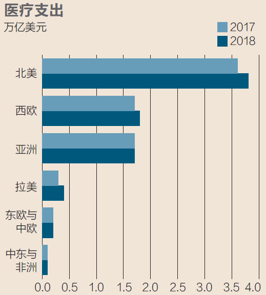 由于发达国家难以满足人口老龄化所导致的需求上升,2018年全球卫生保健支出预计将增加4%。然而在老龄化现象严重的西欧地区,药品预算仅占卫生总预算的12%,从比例上看低于其他地区,预算不足将拉低卫生保健支出的增长。