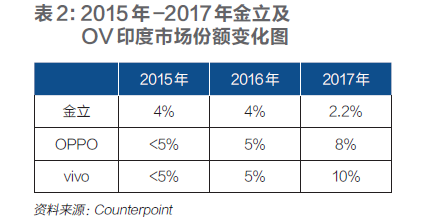 如果算上代工时期,耕耘八年,金立曾是印度线下市场的翘楚,但局面随着2014年底OPPO和vivo的到来彻底改变。金立的份额从排名前一二的中国品牌滑到了第四五位,前后不到两年。